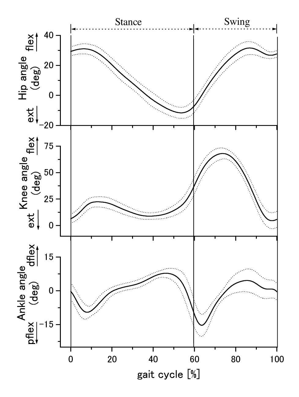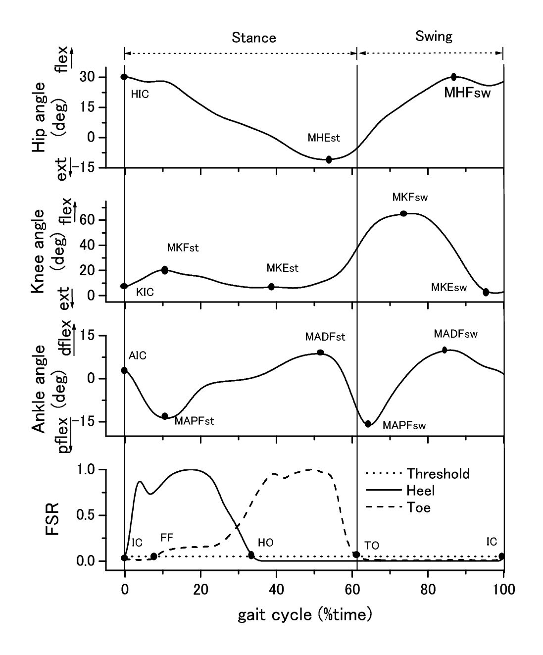 Gait is one of the cyclic movements. Each gait cycle is divided into two phases, the stance phase and the swing phase. In a certain sub phase of the gait, the movements of the joints reach certain joint angles (e.g. maximum knee flexion angle of swing phase, maximum ankle dorsifelxion angle of swing phase, ankle joint angle at initial contact). Gait cycle is a single sequence of events between two consecutive initial contact of the same limb. A single cycle of the gait is detected between two successive events of contact of the foot with the ground of the same leg. The gait cycle is illustrated in Figure 1 by an example of the level gait. Contact of the foot with the ground is illustrated by the output signal of the force sensitive resistor (FSR) measured from an experiment. Gait phases is divisions in the gait cycle that represent particular functional patterns. The gait cycle is divided into two phases, the stance phase and the swing phase. The stance phase was defined as time interval when the foot is contacting with the ground. The swing phase was defined as time interval when foot is not contacting with the ground. Initial contact (IC) is the point in the gait cycle when the foot initially makes contact to the ground. Heel off (HO) is the point in the stance phase at the heel leaves the ground. Foot flat (FF) is the point in the time in stance phase when the foot is in plantar grade. Toe off (TO) is the point in the gait phase at foot leaves the ground with the toe.